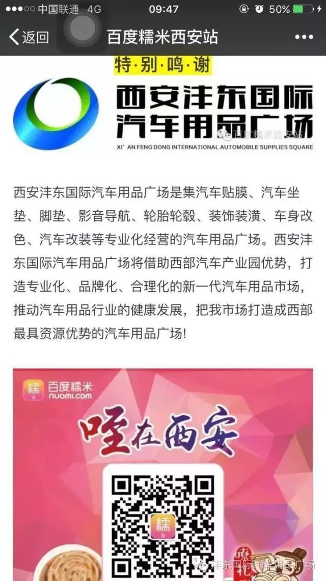 沣东国际汽车用品广场宣传介绍在百度糯米官方APP上推送,凡是关注百度糯米的用户都可以看到关于沣东国际汽车用品广场的宣传简介哦!